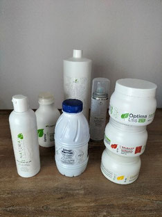 4) Optima Liss « vert » Masque hydratant 98 %naturel au jus d’Aloé-Véra. Pour tous types de cheveux. Laisser agir 3 à 5 minutes avant de rincer et coiffer.